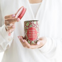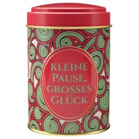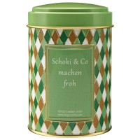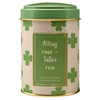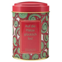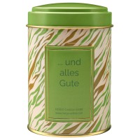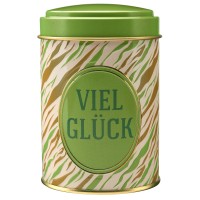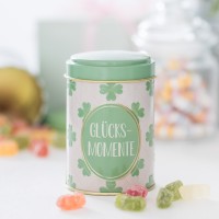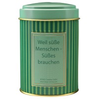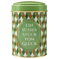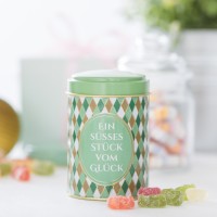 Dose & Inhalt: Hochwertige Süssigkeitendose mit Prägung und teilweisem Golddruck, gefüllt mit je 100g Fruchtgummi