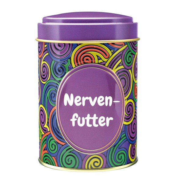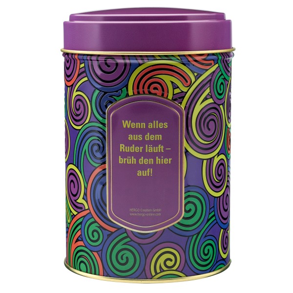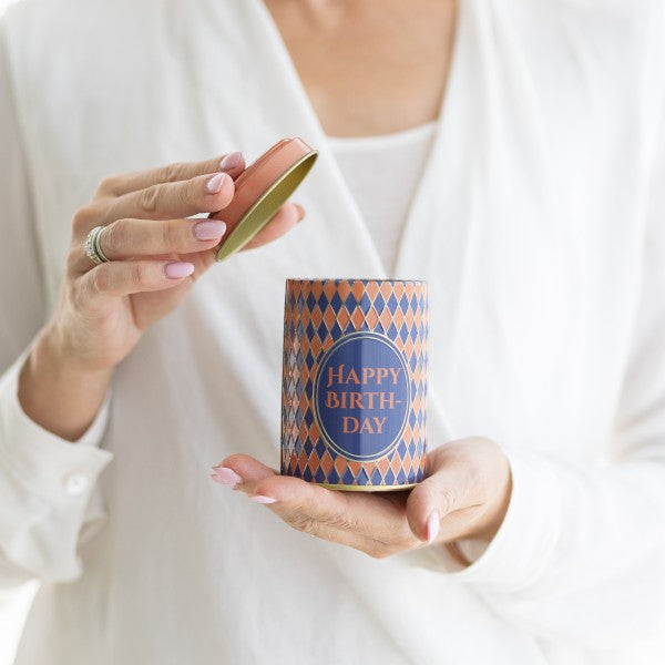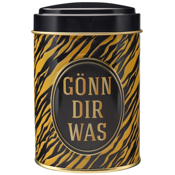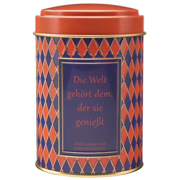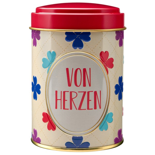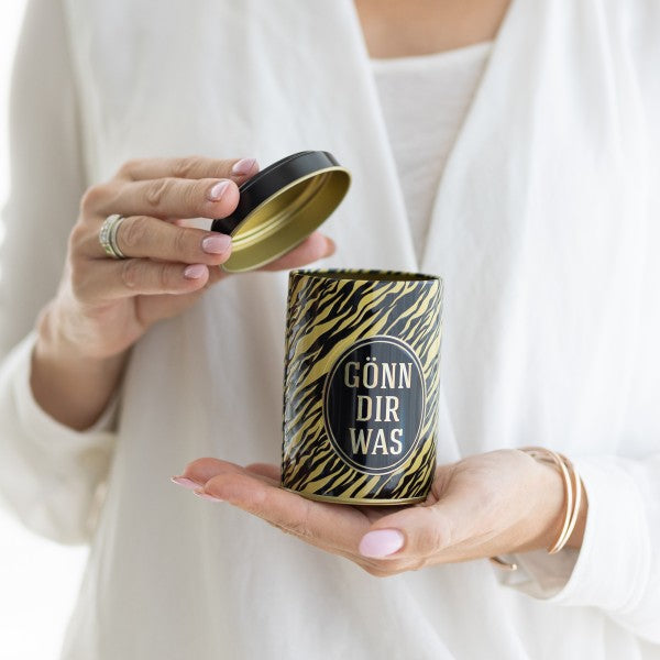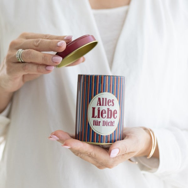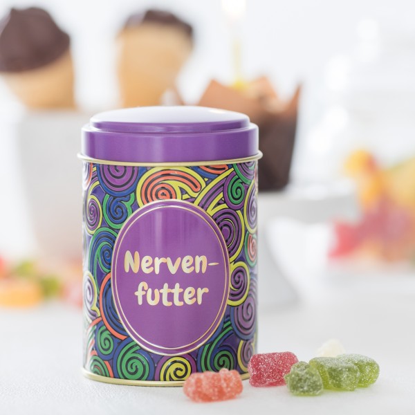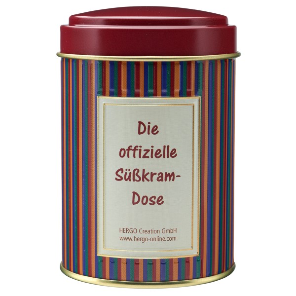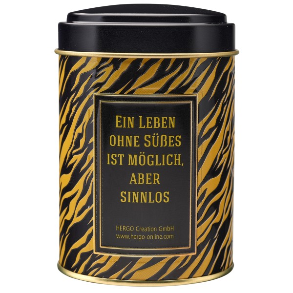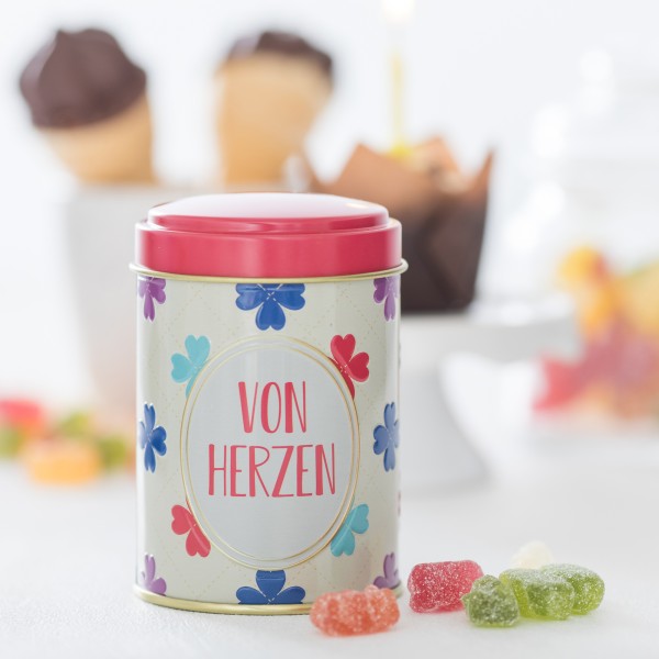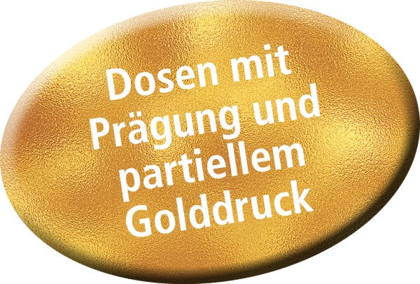 Dose & Inhalt: Hochwertige Süßigkeitendose mit Prägung und teilweisem Golddruck, gefüllt mit je 100g Fruchtgummi