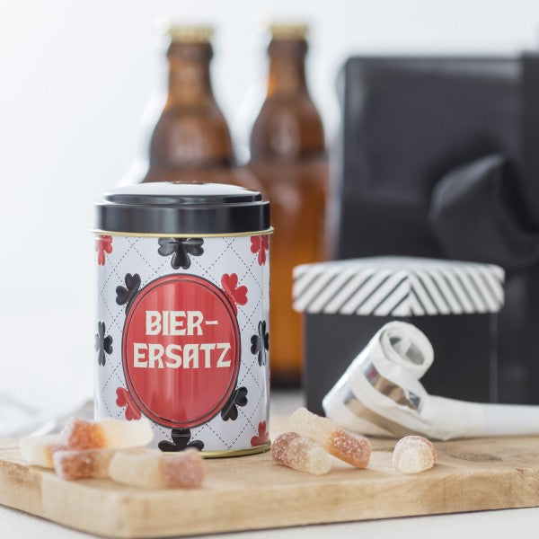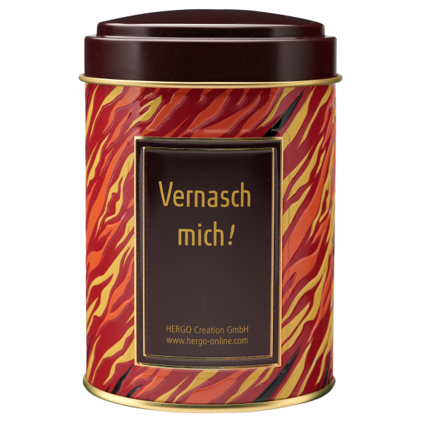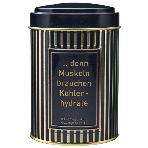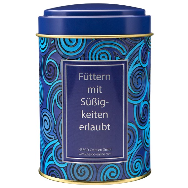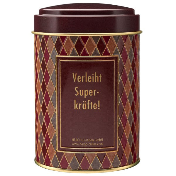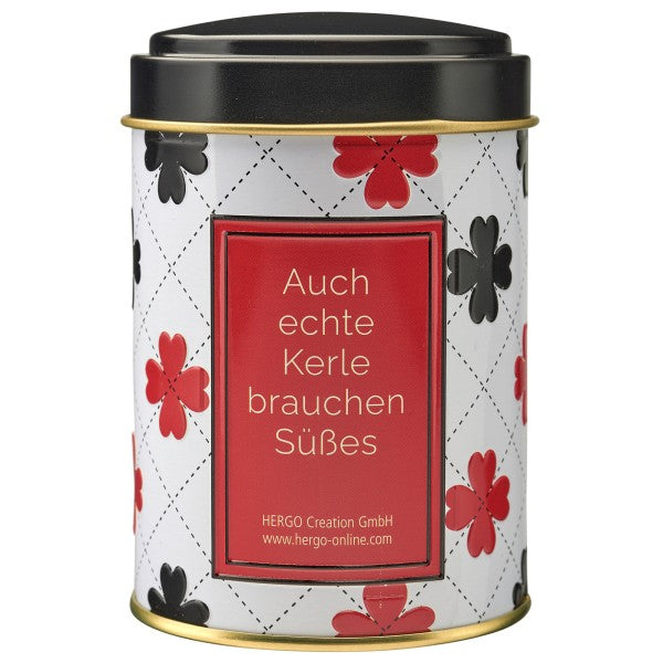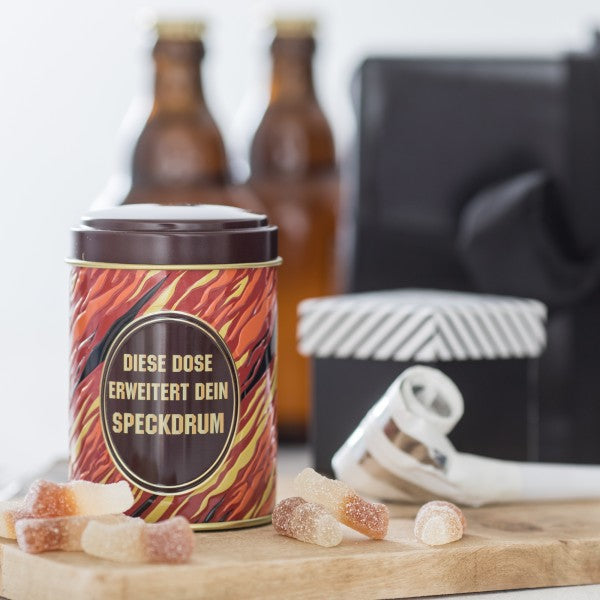 Dose & Inhalt: Hochwertige Süßigkeitendose mit Prägung und teilweisem Golddruck, gefüllt mit je 100g Fruchtgummi
